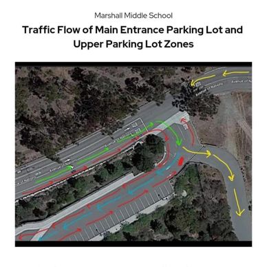 (2) Blue Path🔵: Continue to the "MAIN ENTRANCE PARKING LOT" to park. These drivers include teachers, staff, parents assisting with drop-off, and others with a reason to park.